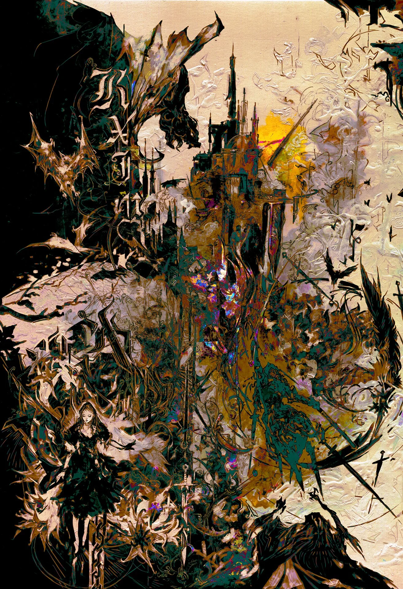 The initial thought was to create a main theme at the center, a towering fort similar to the ones in tarot, abyss by the forces surrounding it. Abstract gothic font designs were added to contrast the theme of the composition. Likewise, this piece is also heavily influenced by Ayami Kojima’s art direction in the Castlevania cover art series. Heavy acrylic textures decorate the edge, florals contrast the themes of the characters, and action posts to guide the viewer in a fantasy story setting of boy meets girl. The heroic days.